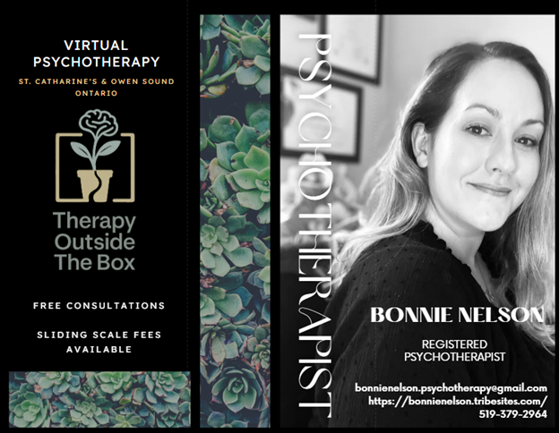 Hello! My name is Bonnie and I’m a Registered Psychotherapist in private practice serving clients online/virtually in and around St. Catharine’s and Owen Sound, Ontario. As your therapist, it is my priority to create a therapeutic atmosphere that promotes growth and positive change for you. I work with clients to address ongoing challenges and realize their goals. Therapy is a process that can help move you towards being the healthiest version of yourself.